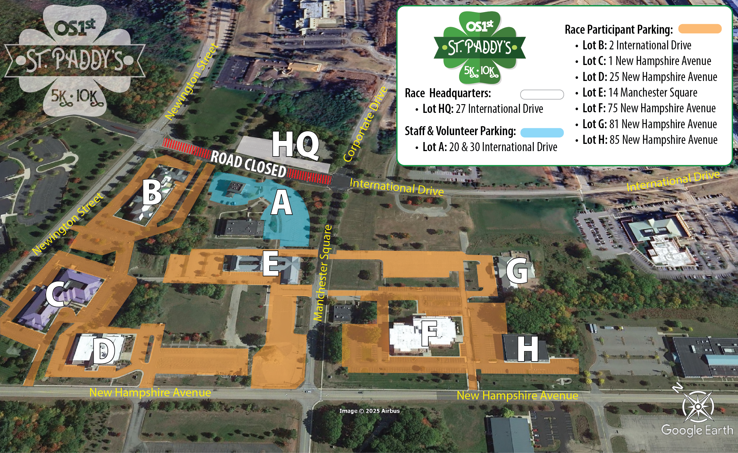 With a Start and Finish right at Paddys American Grille for both the 5k & 10k distances, this Irish-themed course is flat and fast! Set entirely within the Pease Development Authority, the 5k is 1 counter-clockwise lap with a quick out & back on Rye St, while the 10k adds a second full lap of the same loop. Everyone is then invited to the post-race party and beer garden hosted by Paddys!